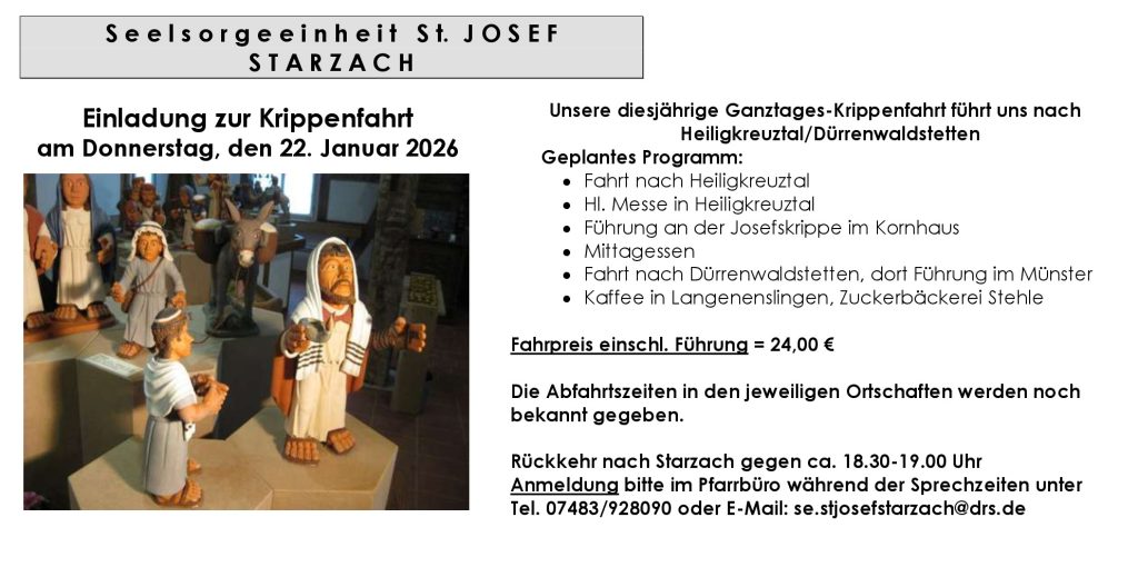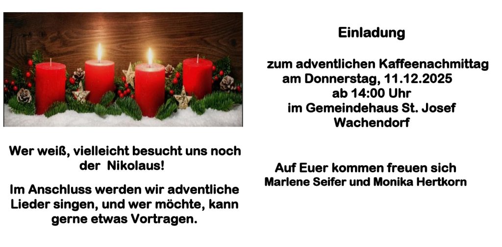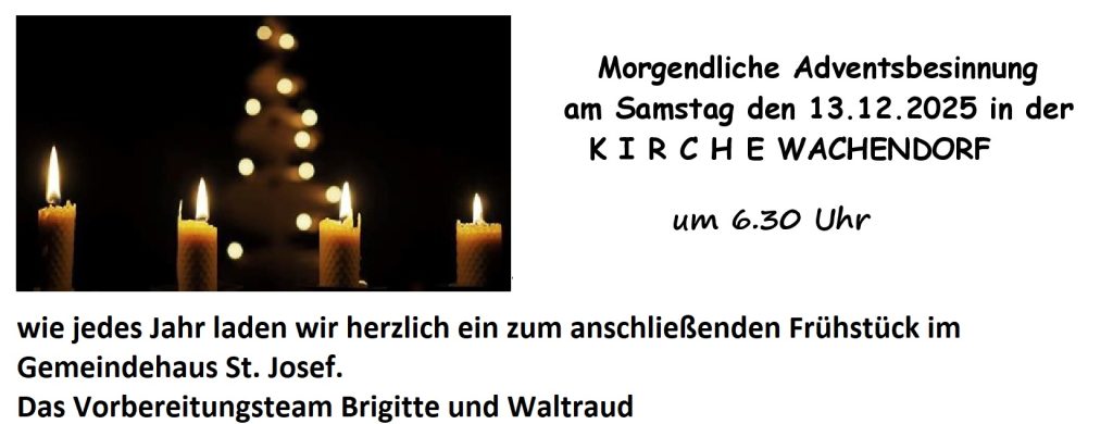 Am Dienstag, den 16.12.2025, 19.15 Uhr findet im Kirchenhäusle eine Gemeindeversammlung statt. Dabei wird der Haushaltsplan 2025/2026 besprochen und verabschiedet. Eingeladen sind alle Katholiken der Gemeinde St. Georg, Sulzau. Um 18.30 Uhr findet, wie üblich, die adventliche Abendmesse statt. Herzliche Einladung!