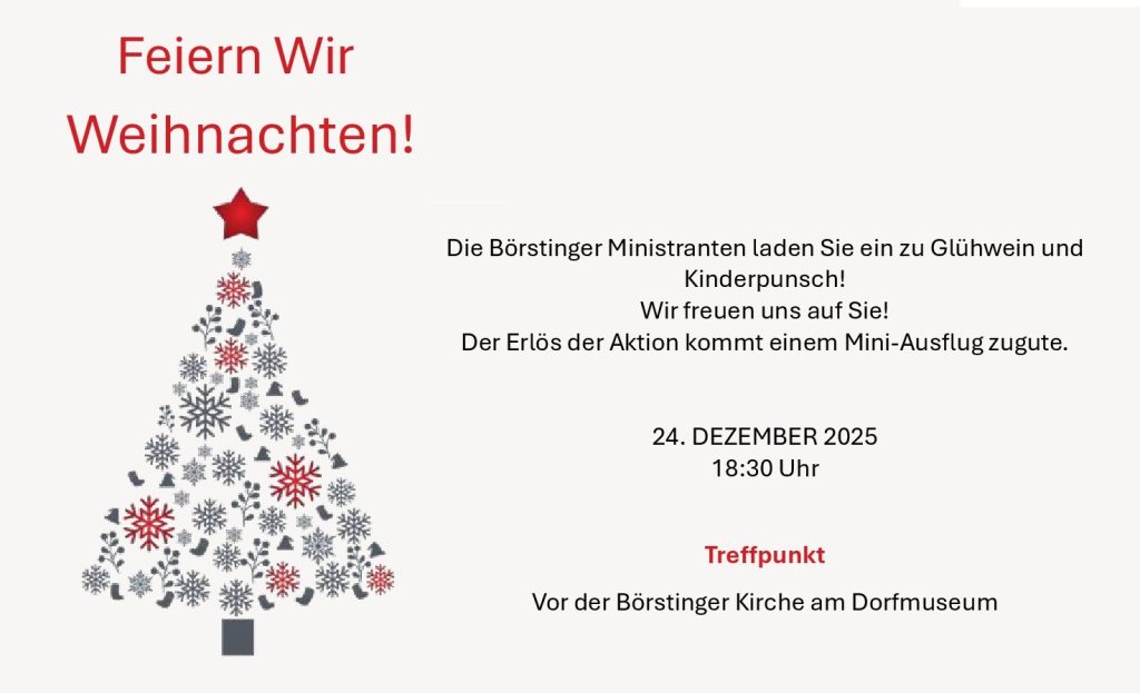 Herzliche Einladung zum vorweihnachtlichen Adventsgottesdienst am 4. Adventssonntag um 18.00 Uhr in Sulzau. Wir laden ein an die landwirtschaftliche Halle der Familie Beiter (am Ortsende von Sulzau Richtung Bierlingen, Eulentalstraße, Kerzen am Wegrand zeigen Ihnen den Weg). Der Gottesdienst findet im Freien statt. Er wird begleitet von einer Abordnung des Musikvereins Börstingen. Anschließend gibt es Rote vom Grill, Glühwein und Kinderpunsch. Bitte bringen Sie eine eigene Tasse mit.